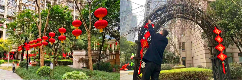 大紅燈籠高高掛,走進小區就看見一抹抹喜慶的紅,掛在樹梢、橫在門楣,喜慶的裝飾營造出濃濃的年味兒,也描繪著家的溫暖與祥和。