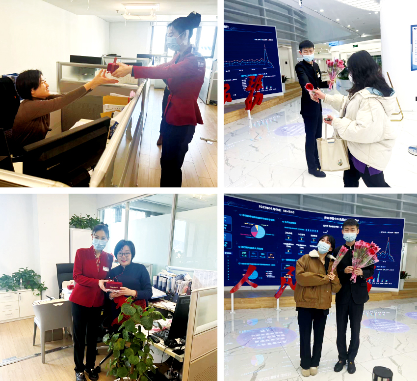 一大早,管理處安排禮儀引導人員為樓內辦公的女士贈送鮮花并送上節日祝福語,并安排各樓層客服將事先準備好的伴手禮盒送到各位女性客戶手里。在這個專屬女性的節日里,收到鮮花和禮物的她們笑的格外燦爛,到處洋溢著幸福的味道。
