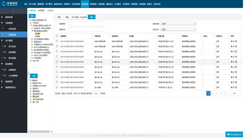 在泛海智慧物業管理中,工程人員對園區每臺設備建立精細的電子化臺賬,包含出廠資料、基礎參數等多項檔案信息,以及工程人員日常對設備的維修、巡檢等記錄。通過統一編碼規則對設備進行標注,直觀地體現設備的屬性及空間位置。